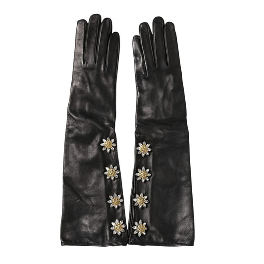 Dolce & Gabbana Black Leather Embellished Long Mitten Gloves